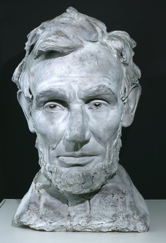 In October 1951, the sculptor Malvina Hoffmann (whose own show at the New-York Historical Society was on view at the time) suggested to her friend and fellow-artist Margaret French Cresson (Daniel Chester French’s only daughter) that she donate a group of her own and her father’s portrait busts and models to the Historical Society. Mrs. Cresson agreed to do so, and began making arrangements with the then-Director, R.W.G. Vail. A year later, she remembered the existence of the full-sized Lincoln head, which had been kept at the Piccirrilli studios but had been lost when the shop broke up. Fortunately, the head was rediscovered at the Roman Bronze Works in Corona, NY, a foundry that produced bronze editions of French’s work. Mrs. Cresson arranged with Salvatore Schiavo, the owner and a second-generation caster, for the foundry to color the plaster model to resemble bronze. It entered the collection of the New-York Historical Society in 1954 (it may have received a new base at the same time), in which year the Historical Society was able to exhibit a gallery devoted to the works of Daniel Chester French and his daughter. In the 1970s, the maquette was painted white, in imitation of plaster, while the work was on loan to Chesterwood, French’s country home and studio that is now a National Trust Historic Site.