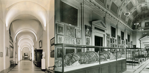 Left: Interior view of the Great Hall, ca 1940, before renovating into the more open Smith Gallery.