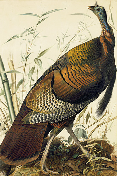 Photo credit: John James Audubon, Wild Turkey (Meleagris gallopavo), Study for Havell pl. 6, 1820. Pastel, watercolor, oil, graphite, and black ink on paper, laid on card; 25 1/2 x 38 15/16 in. (64.8 x 98.9 cm). Purchased for the New-York Historical Society by public subscription from Mrs. John J. Audubon, 1863.17.6