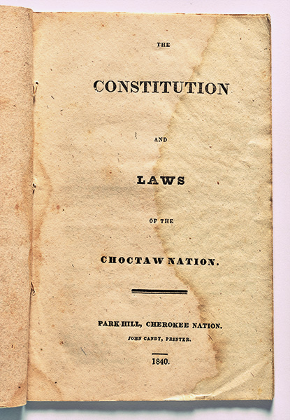Choctaw Nation Constitution of 1838 / The Constitution and Laws of the Choctaw Nation Park Hill, Cherokee Nation: John Candy, 1840. Photo credit: Ardon Bar-Hama
