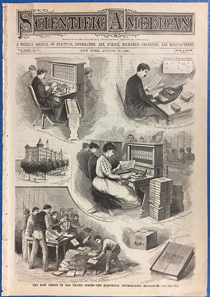 In the wake of the Civil War as the population grew and expanded west, the 1880 census reports took eight years to finish. An 1890 copy of Scientific American illustrates how the counting was accomplished in less time with the Punched Card Tabulator system invented by Herman Hollerith, a former census employee from Buffalo, New York. Divided into four devices for perforating, reading, and sorting, workers completed 62.9 million returns of 30 questions in less than five years.