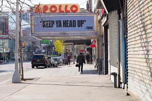 Hickman’s images also capture a unique moment in New York City, when usually bustling sites like Times Square, Grand Central Terminal, the Staten Island Ferry Terminal, and LaGuardia Airport were eerily empty; neighbors cheered and applauded from their windows to thank essential workers; masked pedestrians walked deserted sidewalks; and marquee signs shared messages of support, such as “Keep Ya Head Up -Tupac” at the Apollo Theater in Harlem and “We’re In This Together – Keep Calm, Wash Your Hands & Take Care of Each Other” at the Kings Theater in Brooklyn.