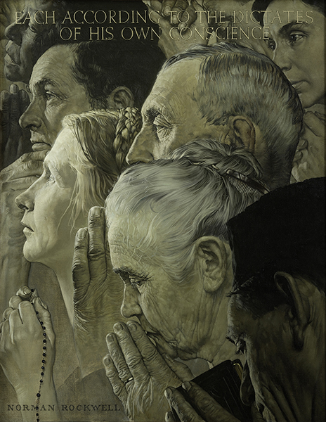 Norman Rockwell (1894–1978). Freedom of Worship, 1943. Oil on canvas, 46” x 35 ½”. Story illustration for The Saturday Evening Post, February 27, 1943. Collection of Norman Rockwell Museum. ©SEPS: Curtis Licensing, Indianapolis, IN