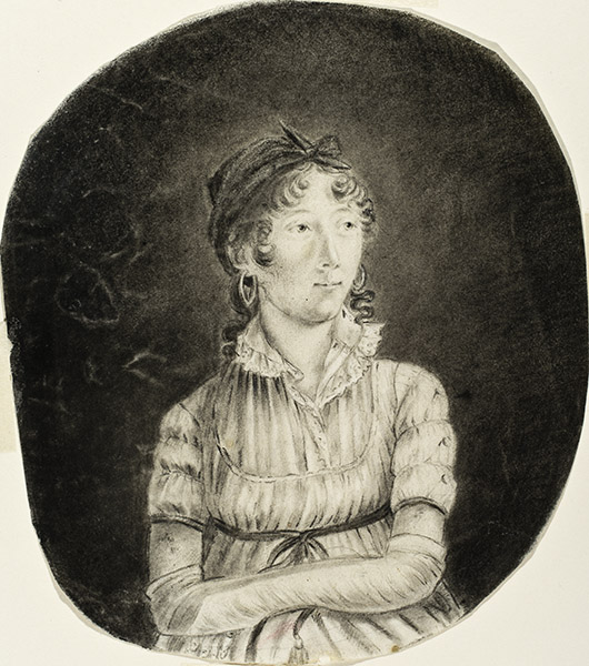 Neuville’s portraits of individuals celebrate the ethnic and cultural diversity of the early American republic, and her portrayals are notable for their ethnographic integrity and avoidance of stereotypes. In the portrait of Peter of Buffalo, Tonawanda, New York (1807), the sitter has ear lobes pierced with earrings and bare feet, traditional for Seneca tribesmen. Wearing an undershirt, a fur piece, and leggings with garters, he carries a tomahawk, a knife, a powder horn, and a string of wampum. In the portrait Martha Church, Cook in “Ordinary” Costume (1808–10), Neuville depicts a cook in her everyday attire, as part of the artistic tradition of occupational portraits that originated in Europe and appeared in New York in the early 19th century.