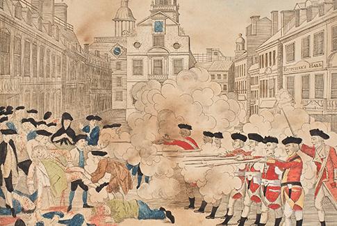 Paul Revere, The Bloody Massacre Perpetrated on King Street, Boston. Hand colored engraving, 1770. American Antiquarian Society. Gift of Nathaniel Paine.