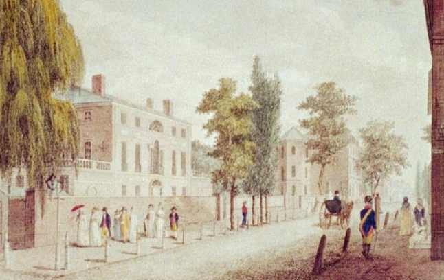 William Russell Birch, View in Third Street, from Spruce Street, Philadelphia, 1800. Hand-colored engraving. Library of Congress Prints and Photographs Division, Washington, D.C., 2002718881.