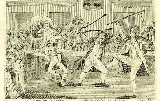 This 1796 political cartoon satirizes a caning episode between Federalist and Republican congressional opponents during the Adams administration, as elected officials stood by, grinning foolishly. In the young government, a man’s honor—his character and reputation—were the main qualifications for office, leading to aggressive, personal responses to political disagreements.
