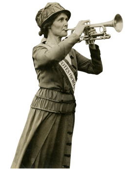 "Miss Rose Bower of North Dakota" Woman playing trumpet, wearing "Votes for Women" sash. Gelatin Silver Photograph, New-York Historical Society.